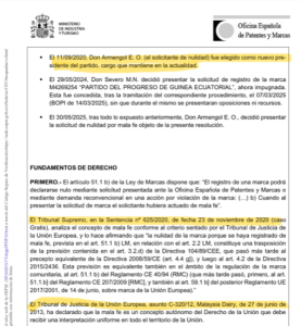 Según la resolución del Registro de Marcas del Ministerio de Industria, el intento de registrar el nombre y los símbolos del PPGE se produjo cuando quien lo promovía ya no ostentaba la presidencia del partido. Severo Moto había dimitido públicamente y, conforme a los estatutos y a la legalidad vigente, Armengol Engonga Ondó fue elegido legítimamente como nuevo presidente. Pretender arrogarse una representación inexistente no solo es una irregularidad política, sino una vulneración directa de los principios democráticos básicos.